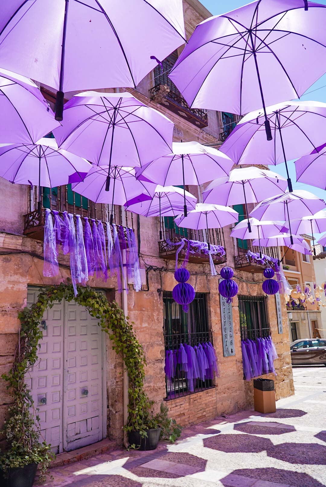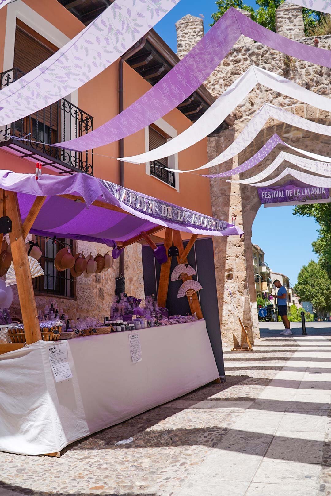 Dedicamos una mañana entera a estar por el casco antiguo de Brihuega. Aparcamos cerca de la Plaza María Cristina, en las afueras del casco antiguo, junto a la entrada principal al recinto amurallado Puerta de la Cadena donde se encuentran los puestos de artesanía y calles decoradas con guirnaldas, paraguas y cintas de color lavanda. Visitamos los campos de lavanda tanto al atardecer como al amanecer, y si te gusta la fotografía, te aconsejo que hagas lo mismo.