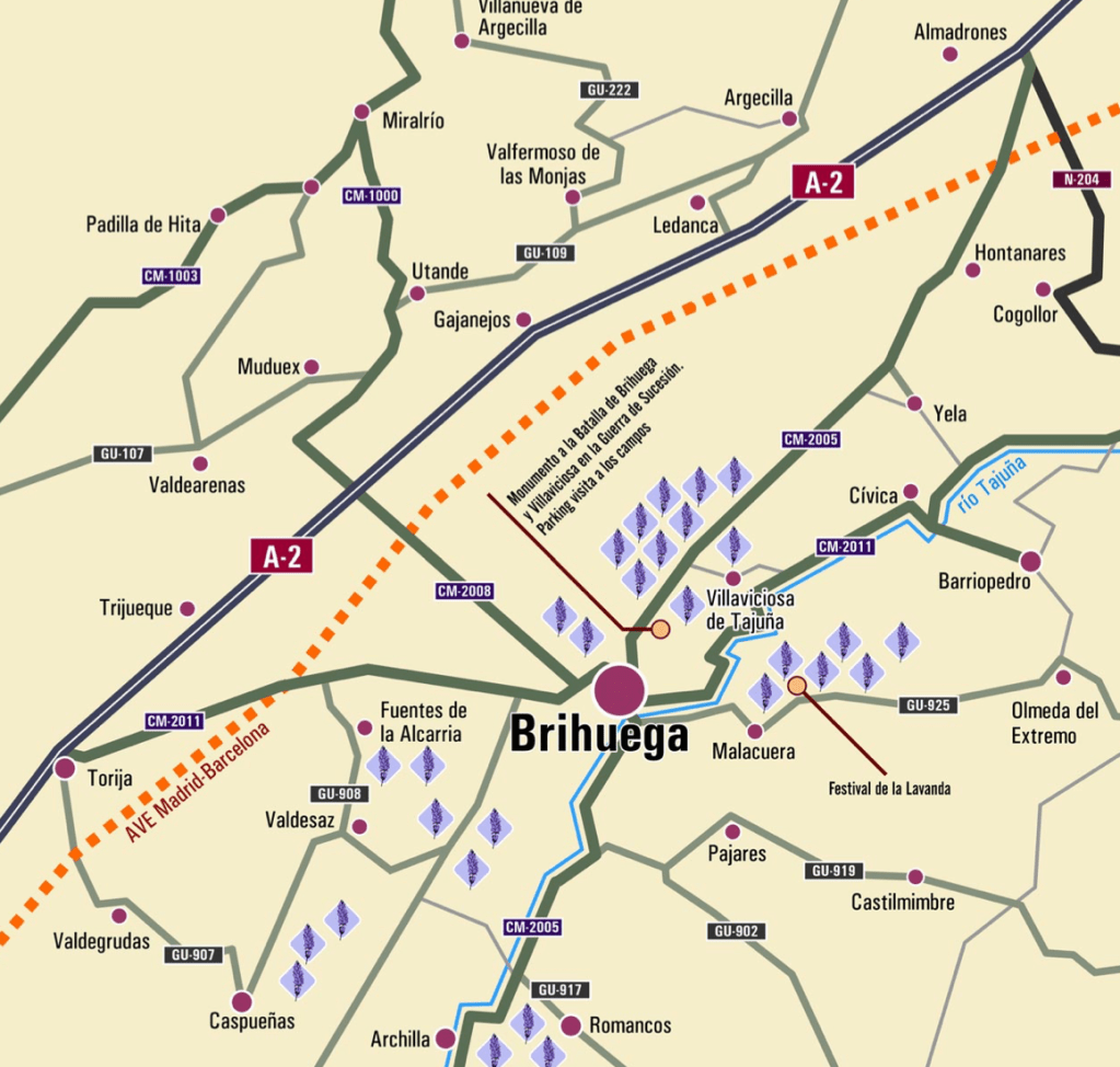 Los jardines de lavanda cubren más de 1.000 hectáreas distribuidas por varios terrenos de los alrededores, principalmente en la Alcarria, y muchos a pocos kilómetros del centro. El turismo de la lavanda está muy organizado. La gran parte de ellos son privados y no son accesibles para el turismo. No obstante, Brihuega ofrece varias localizaciones como circuito turístico y están en perfecto estado. Nosotros fuimos a sobre el 20 de julio y estaban en su máximo esplendor.