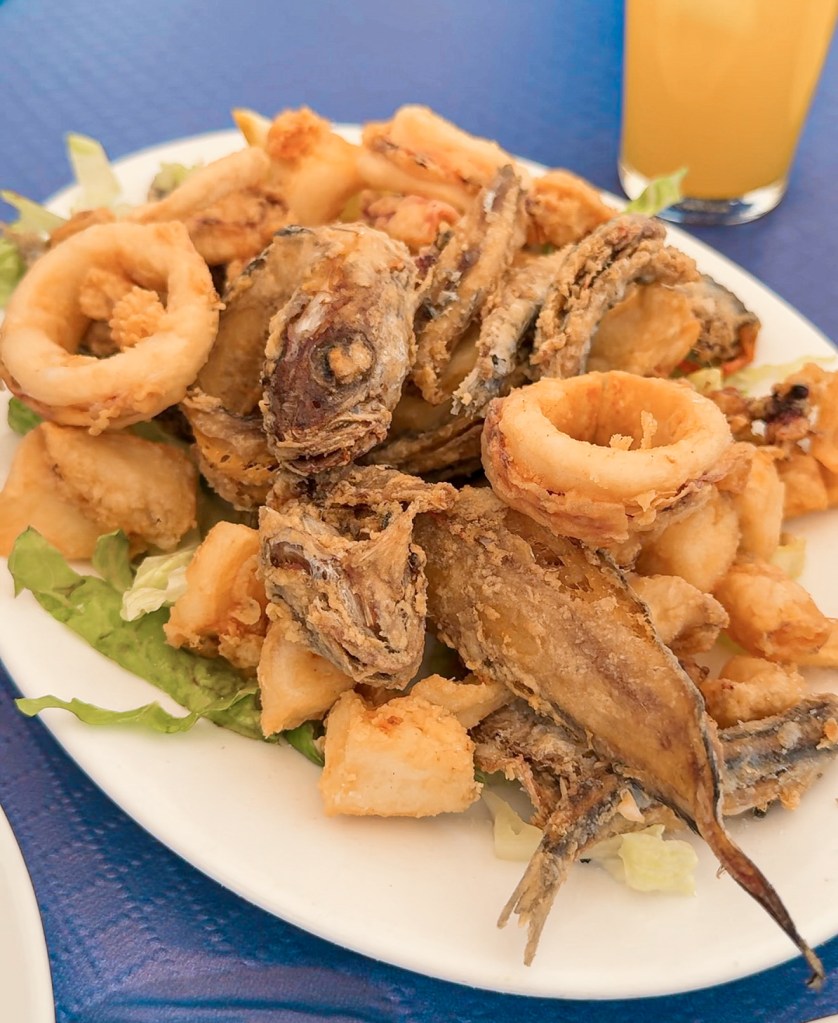 Para comer, una buenísima opción es una Fritura en Bar la Plaza, en el centro del pueblo, donde tanto locales como turistas disfrutan de una gran terraza, en un un ambiente animado y típico andaluz. Además, de este, tendrás otras opciones con vistas al mar en zona más costera del pueblo. No obstante, esta fue nuestra elección y fue muy agradable.