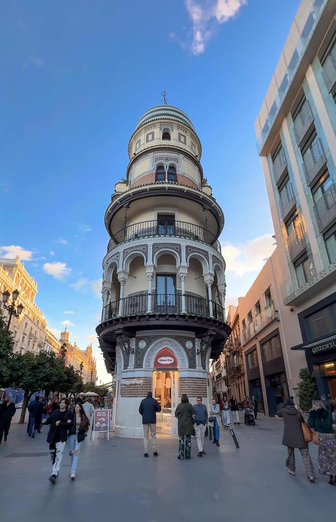 La Avenida de la Constitución es una de las calles principales y más famosas de Sevilla, y conecta la Plaza Nueva con la Plaza del Triunfo, donde se encuentran la Catedral y la Giralda. Además, es un importante eje comercial y cultural, siendo un punto clave para el turismo y ofreciendo tanto a visitantes como a locales una zona animada y colorida para el ocio y el disfrute. El Edificio La Adriática es uno de los edificios más populares de esta avenida y las fotos con este edificio de fondo quedan muy chulas.