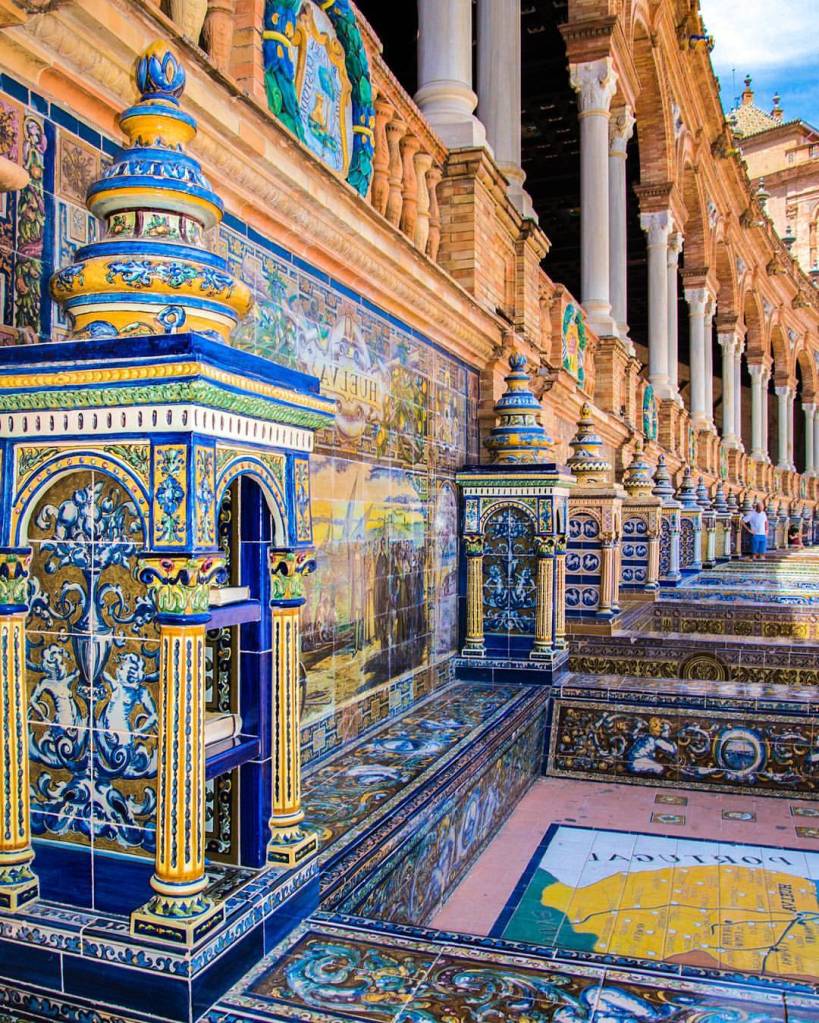 La Plaza de España en Sevilla es uno de los lugares más impresionantes de la ciudad, un verdadero icono de la arquitectura andaluza. Es la plaza más grande del país, con una superficie de 50.000 m², y realmente es un lugar espectacular, que sorprende nada más llegar a ella y que pasarás un buen rato descubriendo todos sus rincones. Los bancos típicos decorados con azulejos que representan cada provincia española le dan un toque único a la plaza y son uno de sus signos de identidad. Es un lugar perfecto para pasear, disfrutar de su grandiosidad y sentirse parte de la historia de Sevilla. Aquí, sin duda, ¡te cautivarás por la belleza del más puro estilo andaluz!