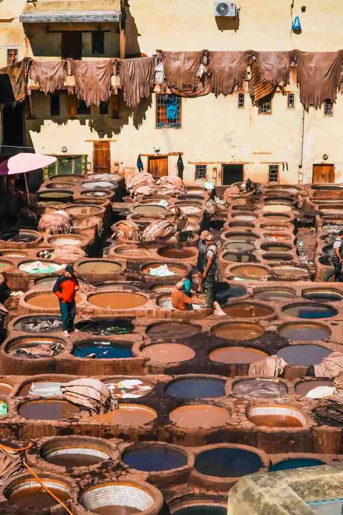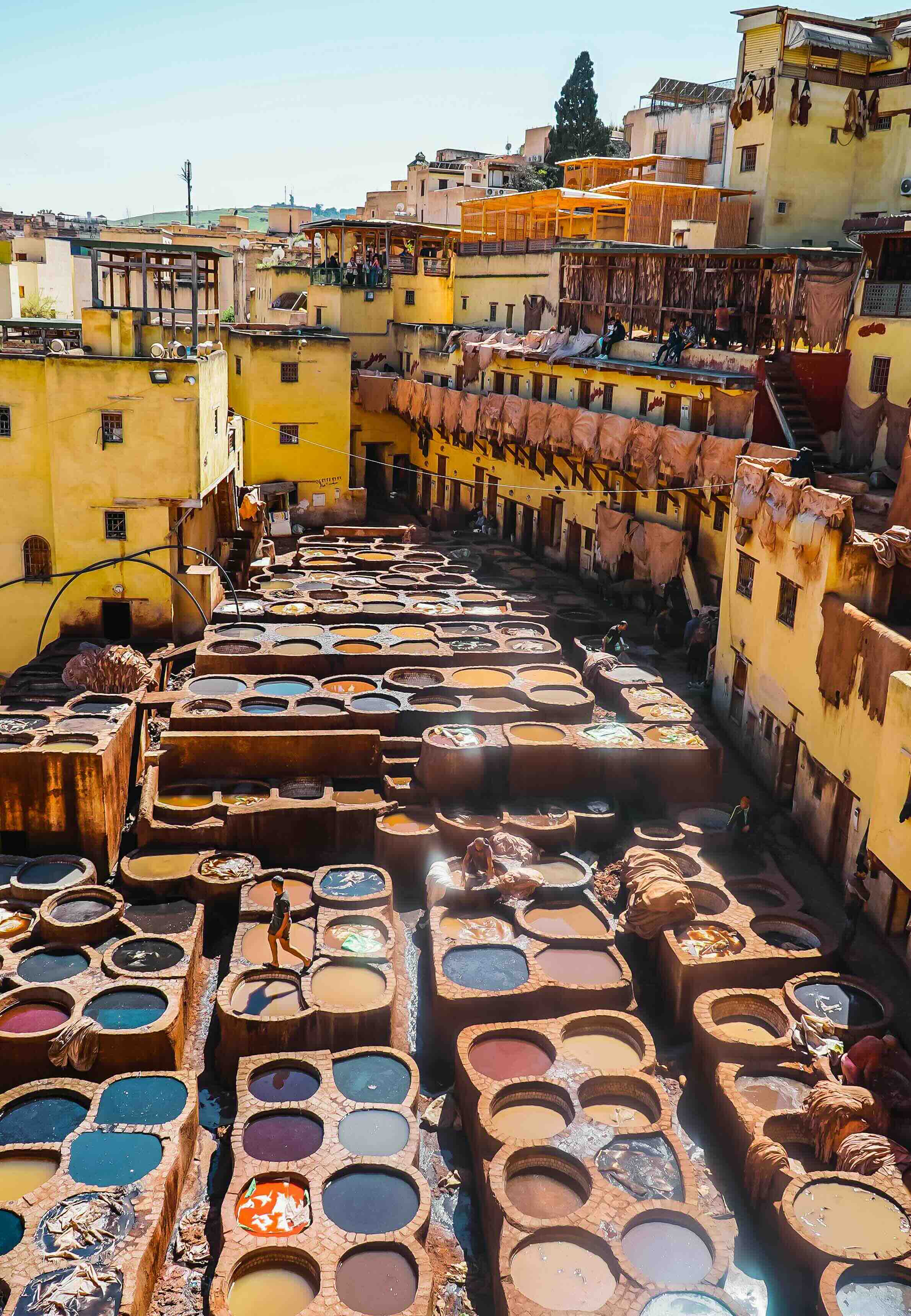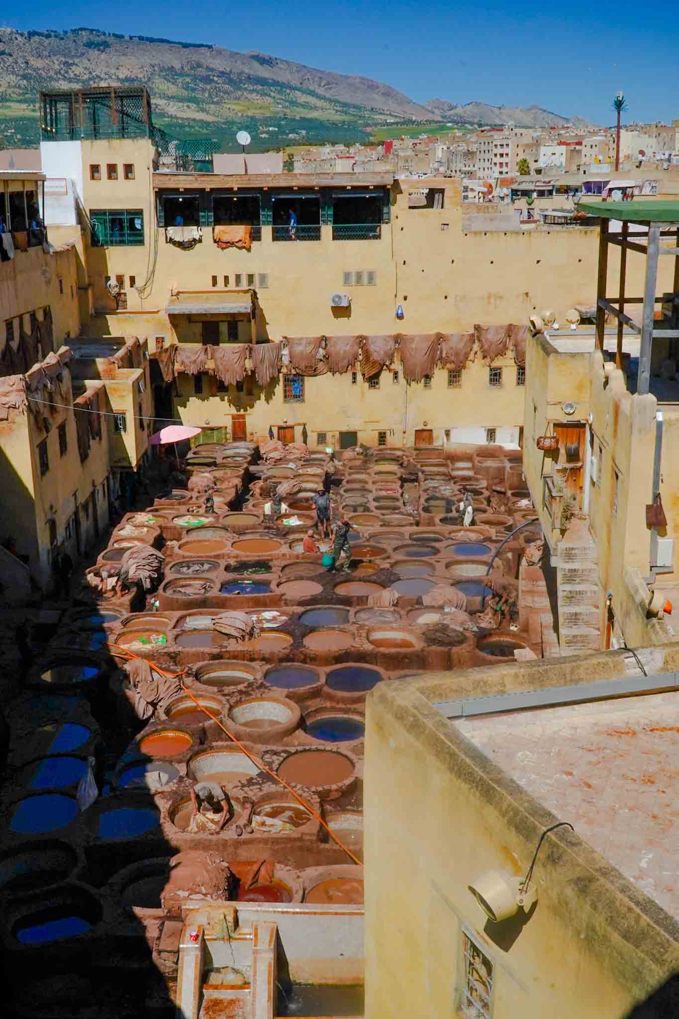Las curtidurías de Fez es uno de los lugares más impactantes de Fez. Son talleres artesanales donde se transforma la piel de animales en cuero utilizando métodos que se han mantenido con el paso del tiempo y que apenas han cambiado desde la Edad Media (aprox. siglo IX-XII), época en la que la Medina de Fez creció como centro comercial, artesanal, cultural y religioso del mundo islámico occidental, llegando a ser la capital política y económica del país.