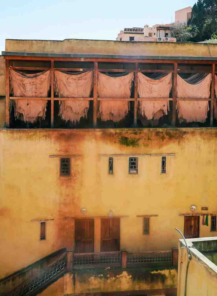 Esta fue la única terraza que no visitamos, sin embargo en la foto puedes ver el balcón en la parte lateral desde donde puedes ver la curtiduría. La curtiduría Ain Azleten es otra de las históricas dentro de la Medina de Fez, menos conocida que Chouara pero igual de impactante. Su patio y terrazas permiten ver el proceso de trabajo del cuero de forma directa, con menos turistas y más tranquilidad, lo que la convierte en un lugar ideal para quienes buscan una experiencia más auténtica y cercana.