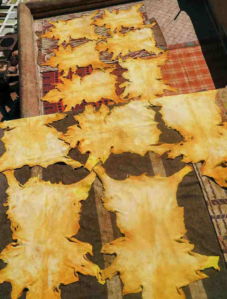 Aquí se tiñen y se tratan las pieles con productos naturales como el índigo, el cromo, la henna o la cal, y luego se secan al aire libre en grandes patios circulares.
